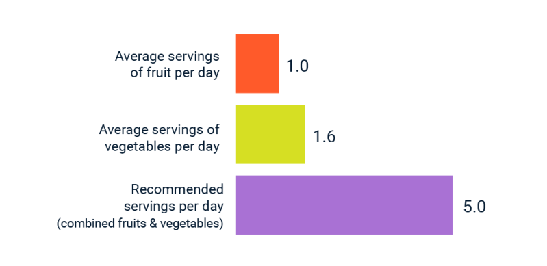 - No US state yet satisfies the Centers for Disease Control’s modest national objectives for fruit (75% of people eating 2+ servings/day) or vegetables (50% of people eating at least 3 servings/day). Only 1 in 10 US adults meets recommendations.4